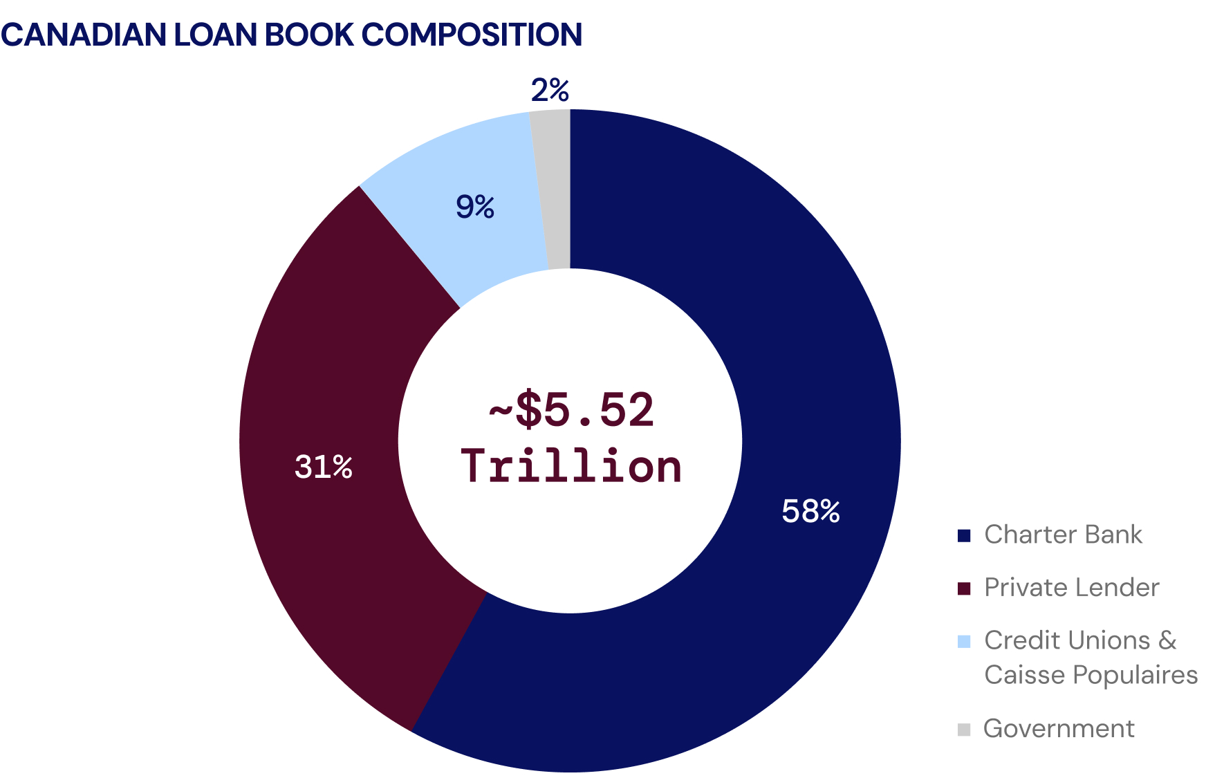 Of the $5.5 trillion in outstanding credit in Canada, 58% are on the balance sheets of chartered banks. These chartered banks hold ~$2.3 trillion of real estate, highlighting a material concentration risk and making the case for greater diversification in lending exposure.