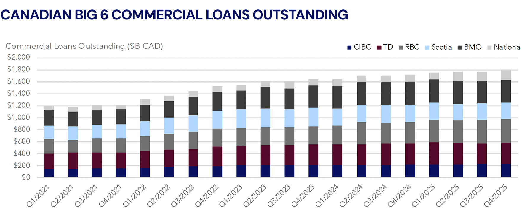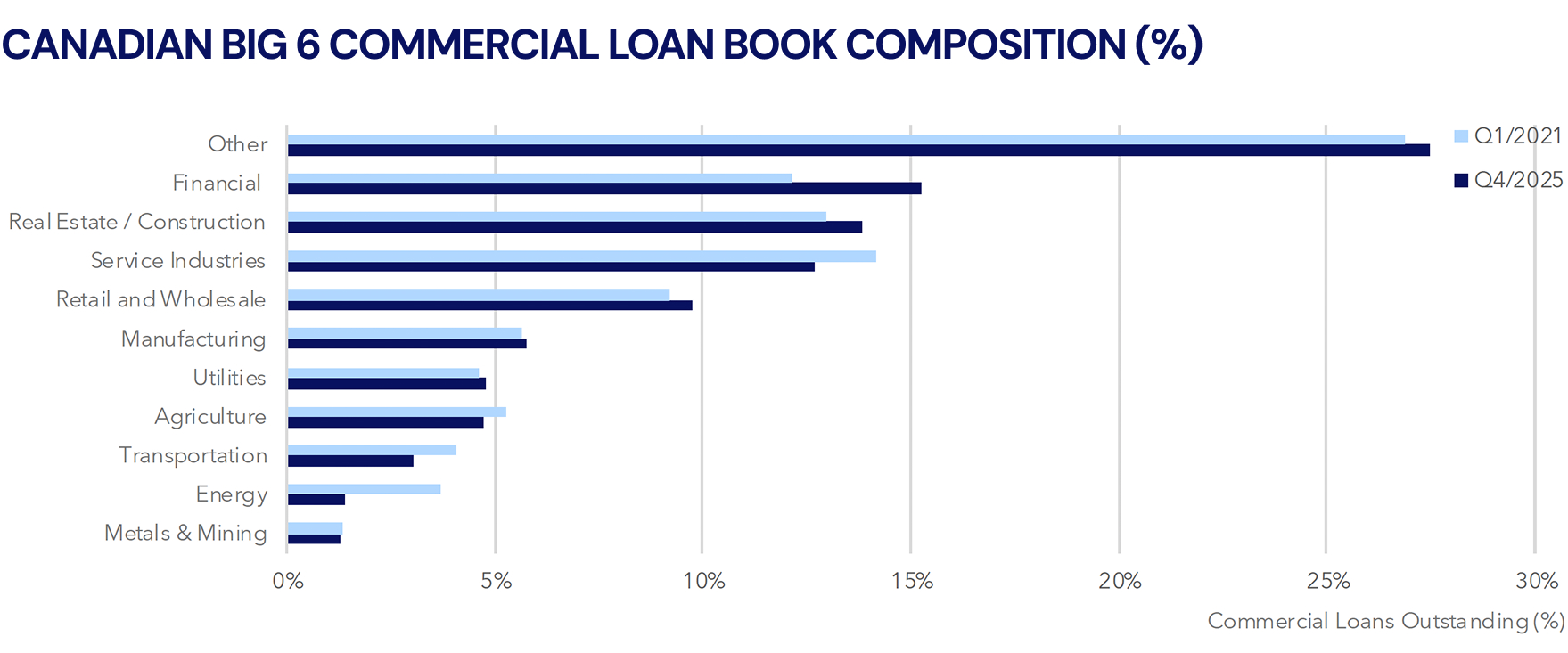 2025 was a banner year for the Canadian Big 6 Banks, who all posted solid loan growth with stable credit profiles. Despite strong performance, real estate continues to dominate loan books, presenting a material risk and reinforcing the need for greater diversification. This note breaks down those loan books by sector which hopefully ties to your business’ financing requirements and the estimated $110 billion of investment Canada expects over the next decade. We see increased opportunities for both traditional lenders and alternative credit to deploy capital across a broader range of sectors.