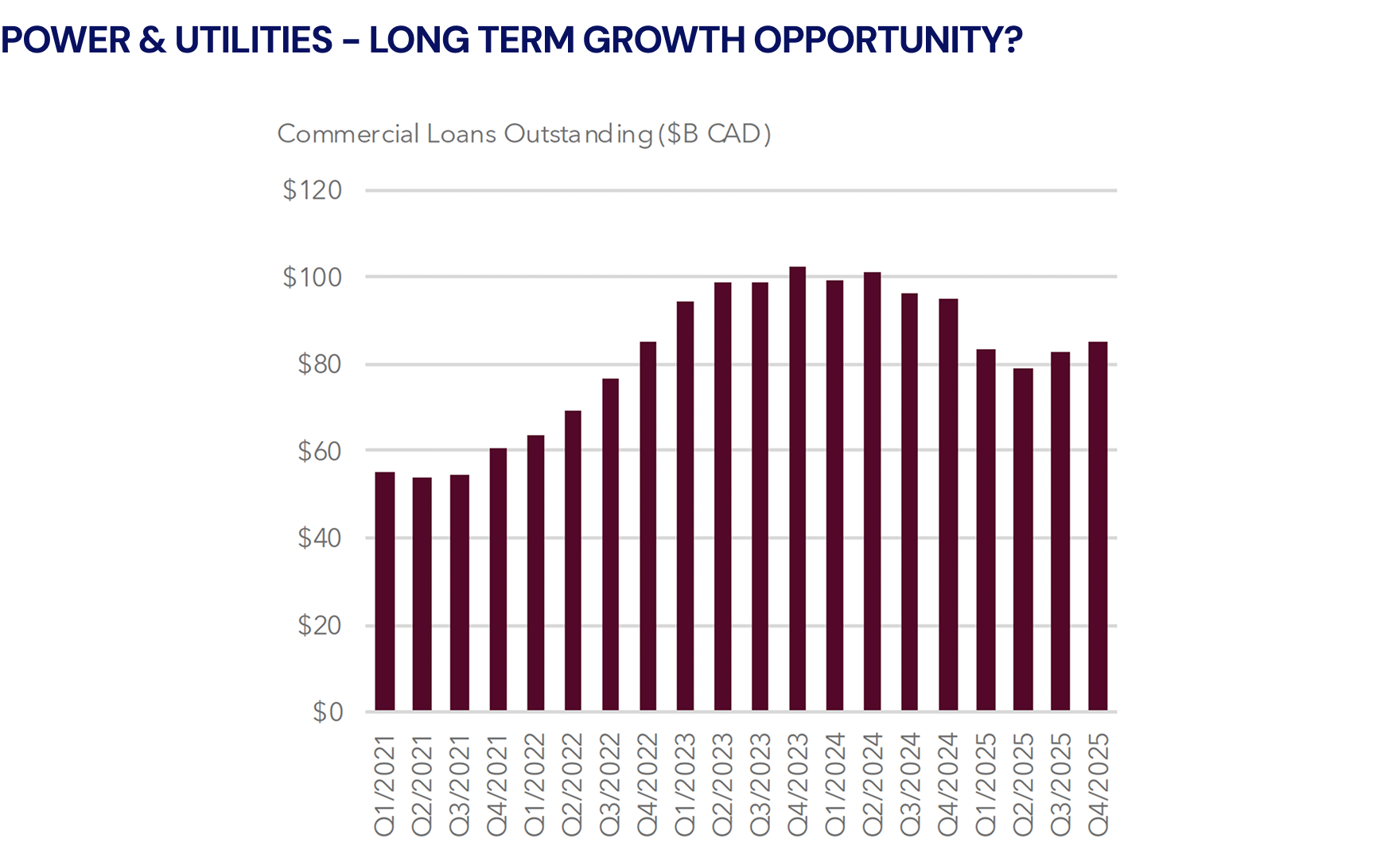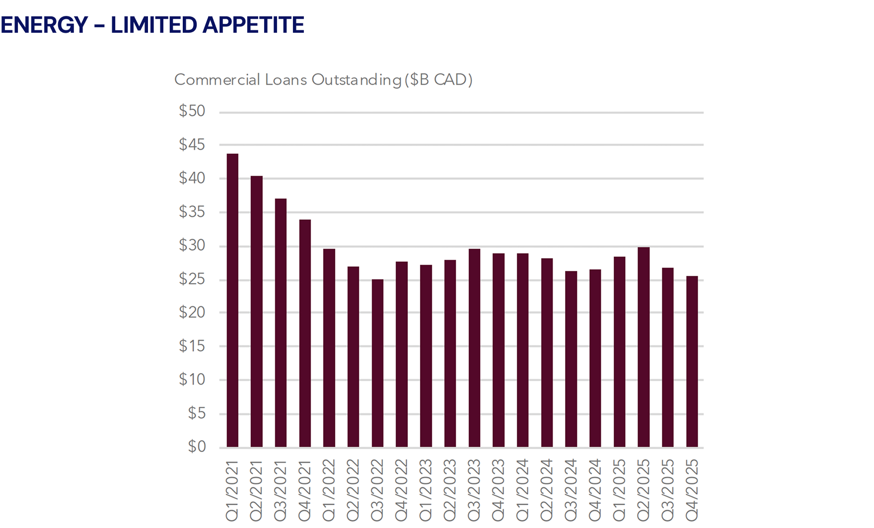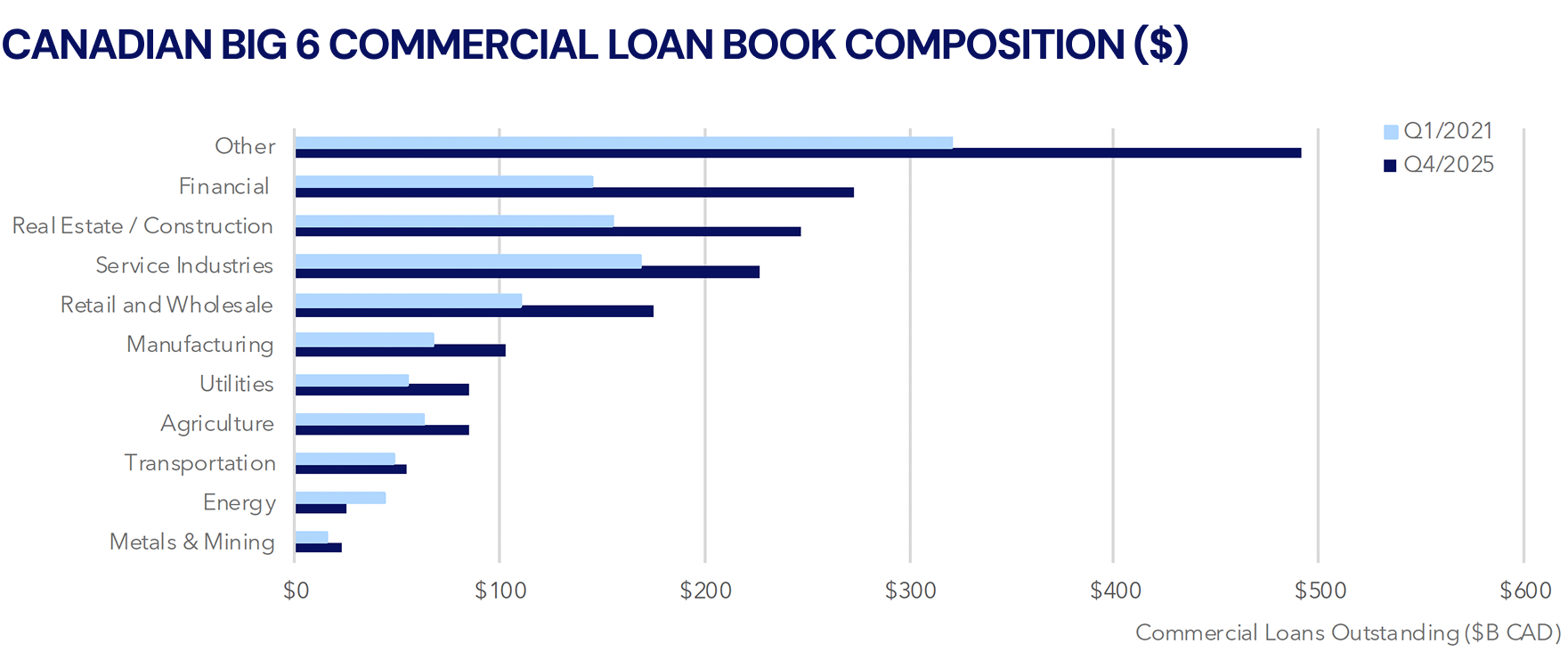 Based on recent announcements, we expect a surge of capital flowing into mining, power generation, and industrial services in 2026 and beyond (but are cautiously optimistic on energy). Over the next five years, the Government of Canada has earmarked more than $110 billion for these sectors, signaling a structural shift in national priorities. Traditional financial institutions appear to have stalled their appetite for these sectors, with loan books shrinking 1–10% in 2025.