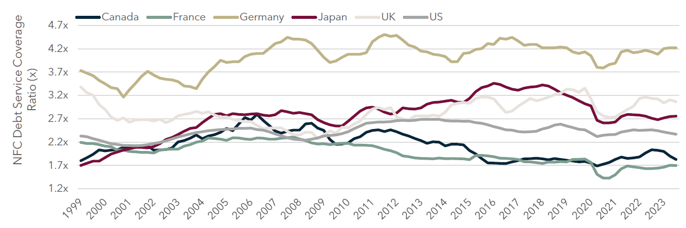 Debt Servicing Consistent in Most of G7: Non-financial corporations in the G7 are mostly remaining consistent with debt servicing, with an average of approximately 2.7x. Canada and France have the lowest ability to service debt at 1.8x and 1.7x, respectively. However, there may be early signs that debt servicing may be deteriorating in Canada.