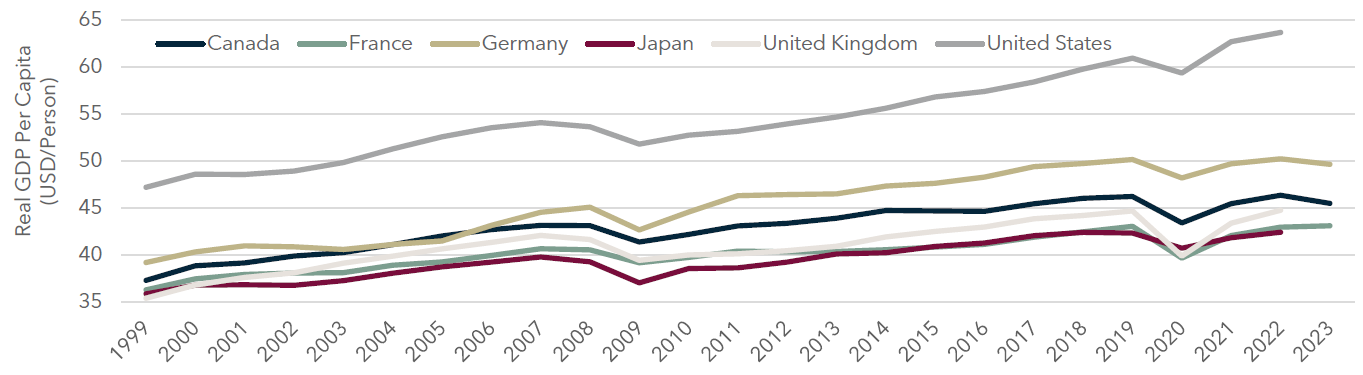 Per Capita Growth Reveals a More Interesting Story: Canada’s rapidly rising population, interprovincial trade barriers, and large Government workforce have led to a decline in labour productivity. This trend is apparent in other G7 nations, with the US and UK being clear exceptions as productivity continues to rise.
