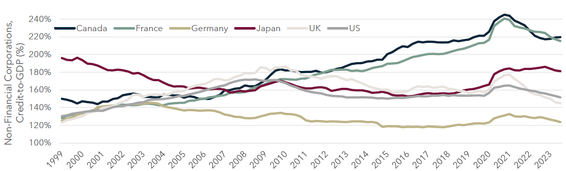 Canadian corporations are the most levered on a debt-to-GDP basis, with Germany again being the least levered.