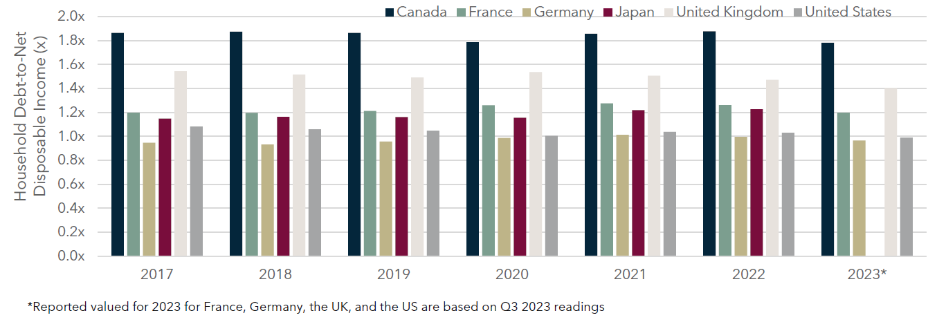 Most G7 Nations Are Maintaining or Declining Household Debt: Since 2017, G7 households had a decline in their household debt-to-net disposable income of approximately 2%, on average. Canada, who has a noticeably higher household debt-to-net disposable income, has experienced a reduction in debt but still leads the pack by a wide margin. Germany was the laggard of reporting G7 nations, only experiencing a 3% decline in household debt-to-net disposable income from 2022 to 2023 but is the least levered of the group.