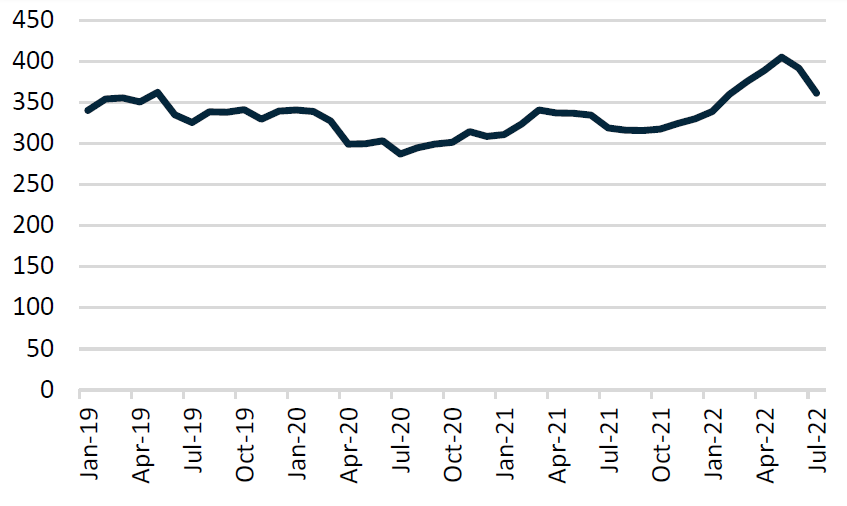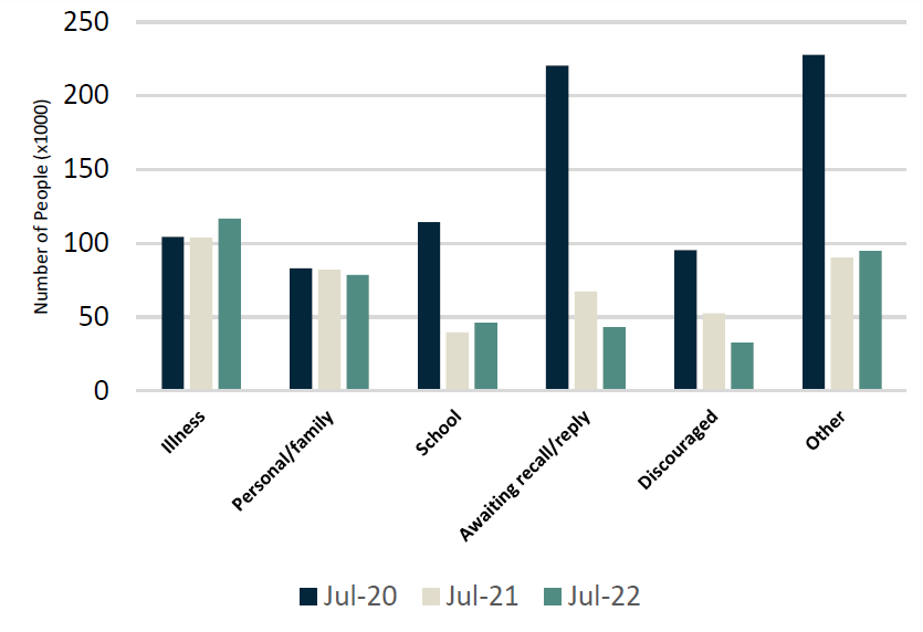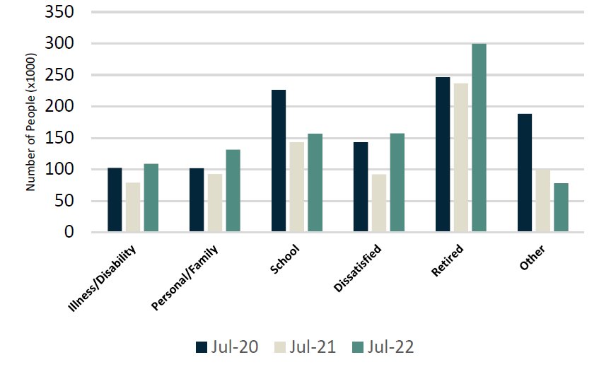 The number of permanent/temporary layoffs declined to a low of ~626 thousand in June 2022 vs. an average of ~1.3 million/month since January 2019 (~1.1 million/month if you exclude COVID months), indicating an employee-driven labour market. However, there was a noticeable uptick in July 2022 at ~853 thousand – we will continue to monitor this trend in the future. Interestingly, the number of people departing the workforce is still below July 2020 and July 2019 levels (~932 thousand in July 2022 vs. ~1 million in July 2020 and ~1.1 million in July 2019), however, is elevated from July 2021 (~743 thousand). The main reason for professionals leaving their jobs in 2022 include dissatisfaction (~70% increase YoY), personal/family reasons (~41% increase YoY) and illness/disability (~38% increase YoY).