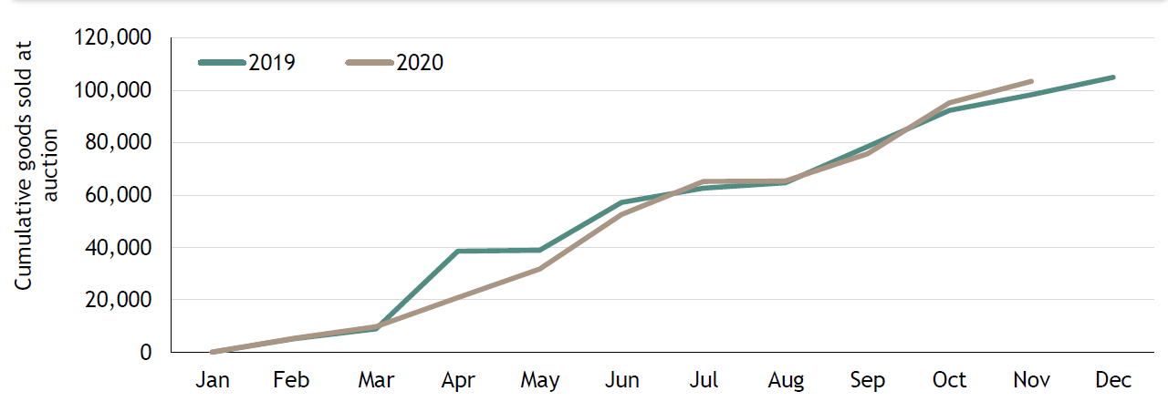 Cumulative Goods Sold at Canadian Prairie Auctions - 2020 vs 2019