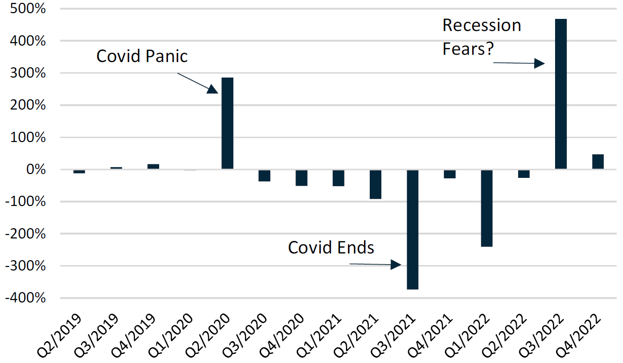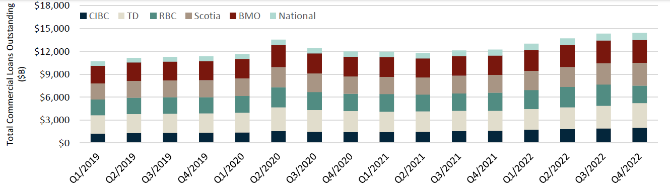 Gross impaired loans are accelerating for the first time since COVID. On aggregate, gross impaired loans now account for 0.6% of all outstanding commercial loans (vs. 0.5% in Q3 2022) and have grown 24% Q/Q in Q4/22 (vs. -5% in 2022 Q3). This provides a signal that there may be tougher economic times ahead.