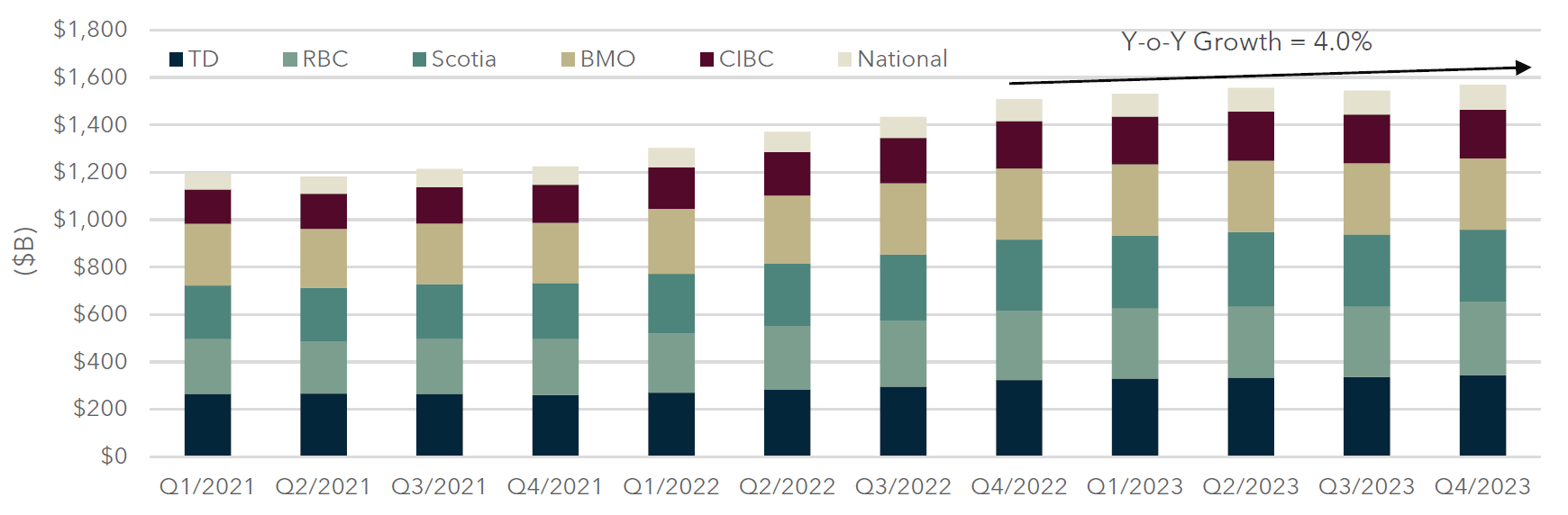 Commercial Loan Underwriting Slows: Quarter-over-quarter commercial loans outstanding grew at a rate of 1.5% in Q4/2023, which was a welcome ‘come-back’ for the Canadian Big 6 who experienced a decline last quarter. Annual commercial loan growth has substantially declined on a Y-o-Y basis; 2023 only saw the Big 6’s commercial loan book grow by 4% Y-o-Y, versus 23% in 2022, but matched the 3.8% average growth rates experienced in 2021 and 2020.