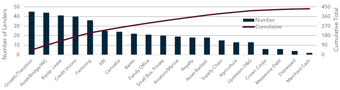 In Canada alone, DWA tracks over 350 private lenders and has them categorized by lending type, security requirements, rate, and size. Our team has never found there to be a lack of private appetite for deals, which is no surprise given the over $430 billion of dry powder available globally.