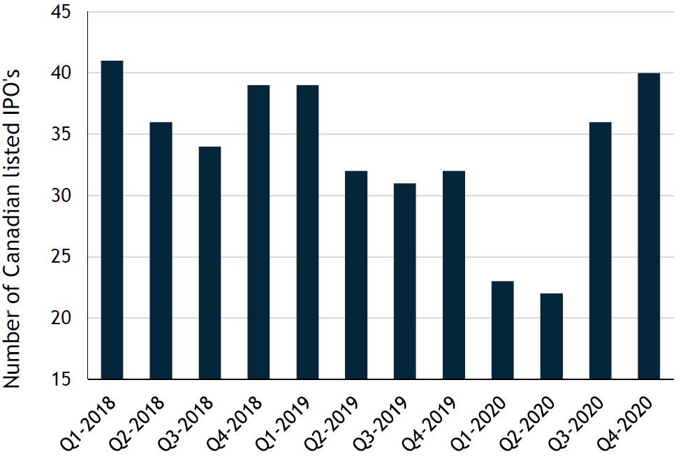 In a typical quarter, Canada sees between 30- 40 initial public offerings (IPOs). The pandemic had a major impact on that in early 2020 but the number quickly returned to run rate levels.