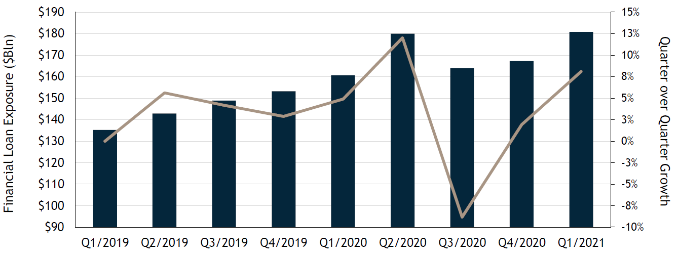 A big driver of the overall growth in commercial loans across Canada relates to growth in the Financial Service and Financing Products sectors. Financing products, which is a smaller portion, relates to asset-backed securities for consumer products (i.e. auto loans, student loans, etc.), mortgage-backed securities, and collateralized obligations. Financial service credit is credit extended to Brokers/Dealers, funds and trusts, hedge funds or insurance companies. This quarter the combined group saw a 9% increase over the previous quarter, adding over $14 billion in new commercial credit.