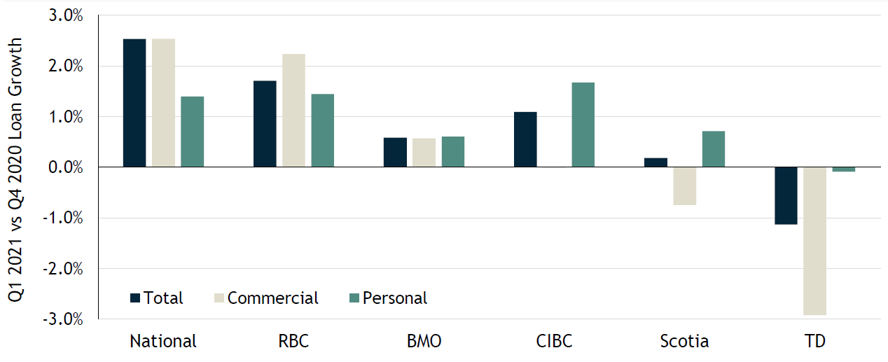 When the pandemic first took hold and commercial borrowing all but shut down, we anticipated 6-8 quarters of commercial credit contraction in Canada as we used the 2008/2009 financial crisis as a guiding light. Last quarter provided strong indications this wasn’t going to be as drawn out as we originally forecast but we are still surprised to see overall commercial credit from Canada’s banks flat to last quarter. RBC and National led the way by expanding their respective commercial credit exposure by over 2%.