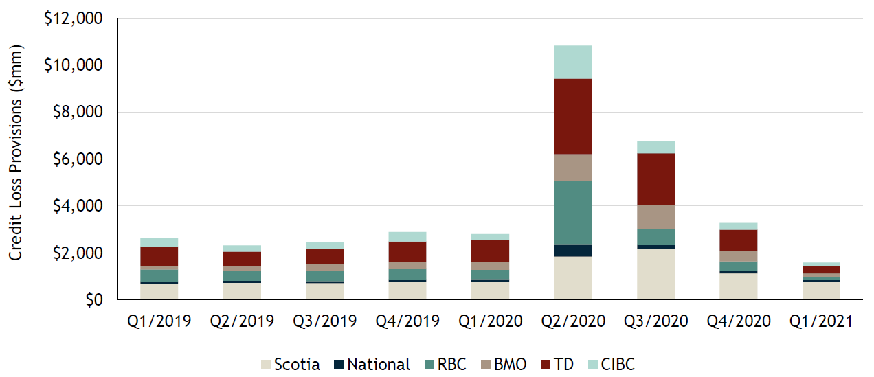 We have often said that loan loss provisions provide the strongest indication of the comfort level from Canada’s top lenders. Continuing the reduction trend we first saw in Q3/2020, loan loss provisions saw another decline this quarter to the tune of 52% (on a combined basis). What is interesting is that the aggregate level from Canada’s main lenders is now below the levels seen pre-pandemic. All of Canada’s banks loss provisions are the lowest in over 2 years, which is quite remarkable.