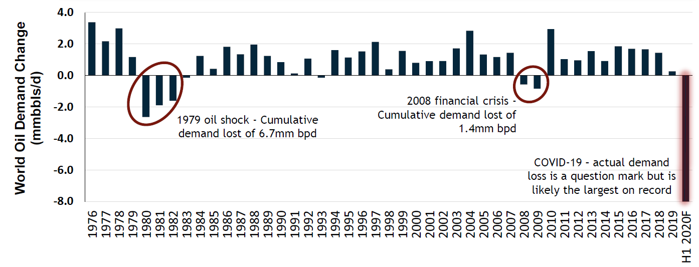 From 2012 to 2014, US Crude and Condensate supply rose over 2 mmbbls/d (35%) as the shale boom took hold. Despite the Saudi’s formally waging war against the US industry in late 2014, US production rose again in 2015. It took sub $30/bbl pricing in 2016 for US production to fall 5%, but this was quickly replaced with record production in 2018 and 2019. Thankfully today’s energy investors care more about return of capital and financial strength than production growth, meaning upstream producers will be more willing to have production decline in order to preserve value. Depending on the duration of the demand destruction from COVID-19, a natural decline in US production is likely not enough to avoid disaster.