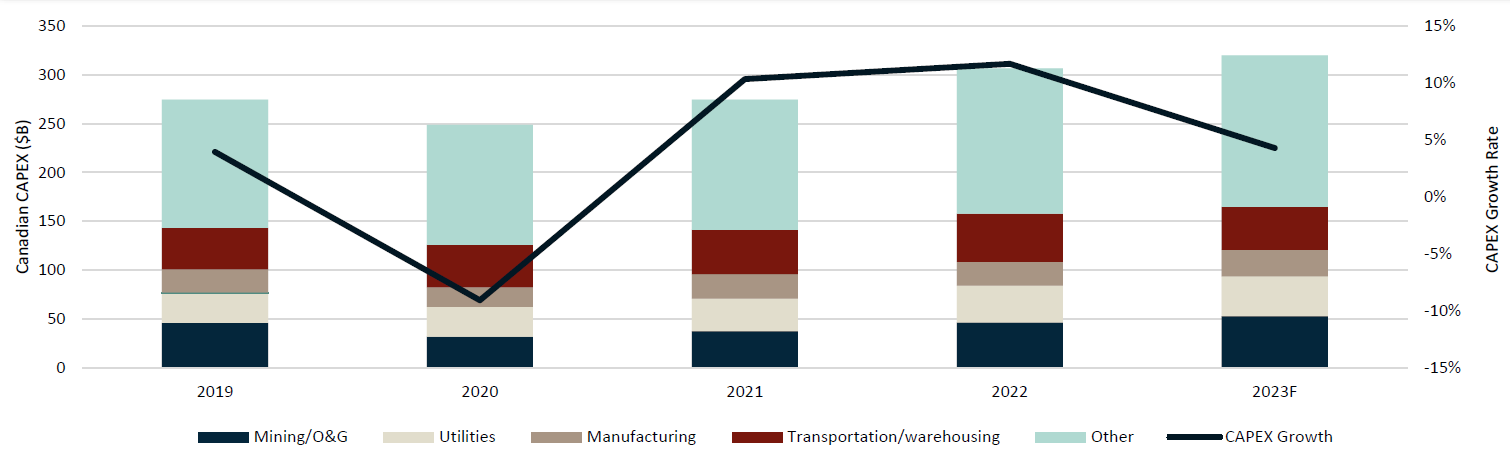 Aggregate Canadian CAPEX spending continued to grow aggressively in 2022 (+11.6% Y/Y vs. ~3.8% Y/Y historically), with the largest increase being attributed to mining, quarrying and oil and gas (+24% Y/Y, composes ~15% of Canadian CAPEX). With rising rates, this trend is not expected to continue in 2023. The BoC is currently forecasting a noticeably slower growth rate compared to the post-COVID era (+4.3% forecast vs. +11% post-COVID) due to their rate hikes. We will monitor this trend through 2023 to see if the BoC’s forecast proves to be true.