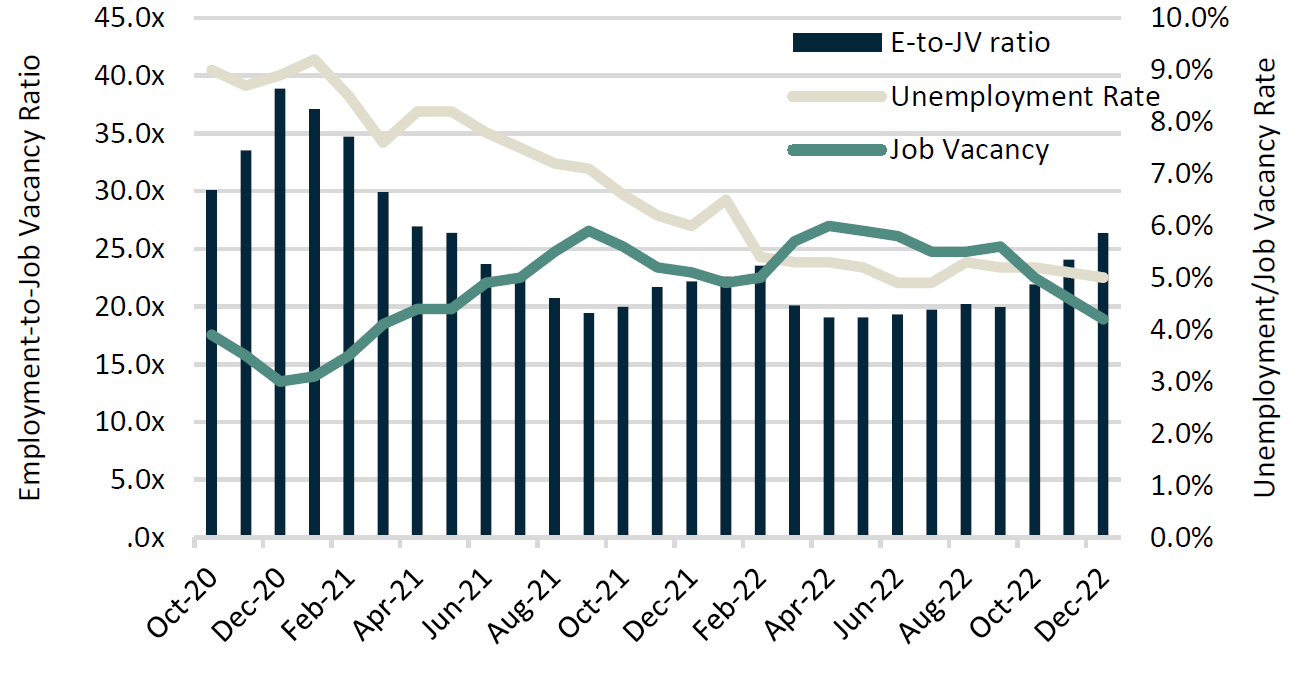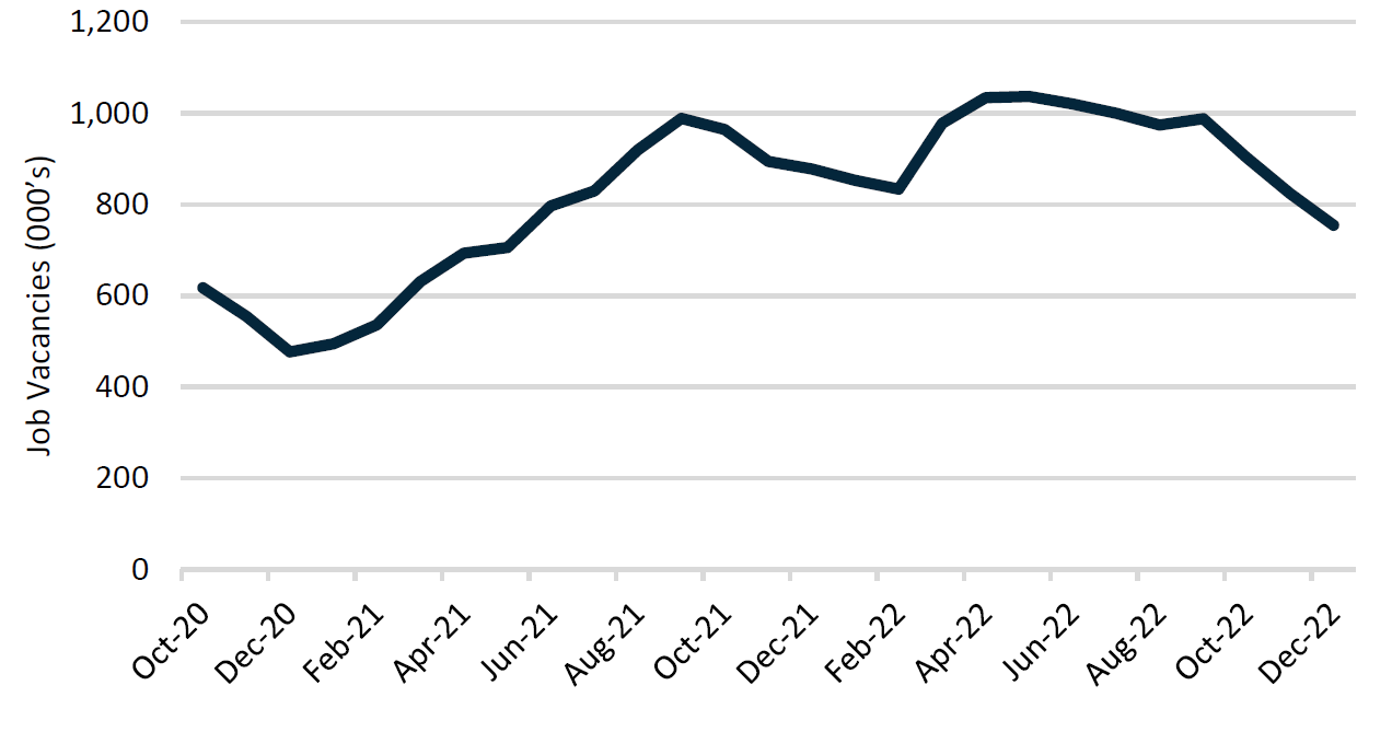 Over 2022, a total of 446,700 FT jobs were added to the Canadian economy with a majority of the gains being attributed to labour force growth (49% of jobs) and re-employment (43%). The overall labour market continues to remain historically tight with the unemployment rate at sub-5% and job vacancies being 64% above their pre-COVID historical average (~754,000 job vacancies vs. 459,000 historical average). However, there are early indications that the labour market is responding to the BoC rate hiking cycle. The employment-to-job vacancy ratio has pivoted since hikes were initiated, and job vacancies are currently in a declining trend. We will continue to monitor these trends as the BoC’s rate hikes continue to impact the economy.