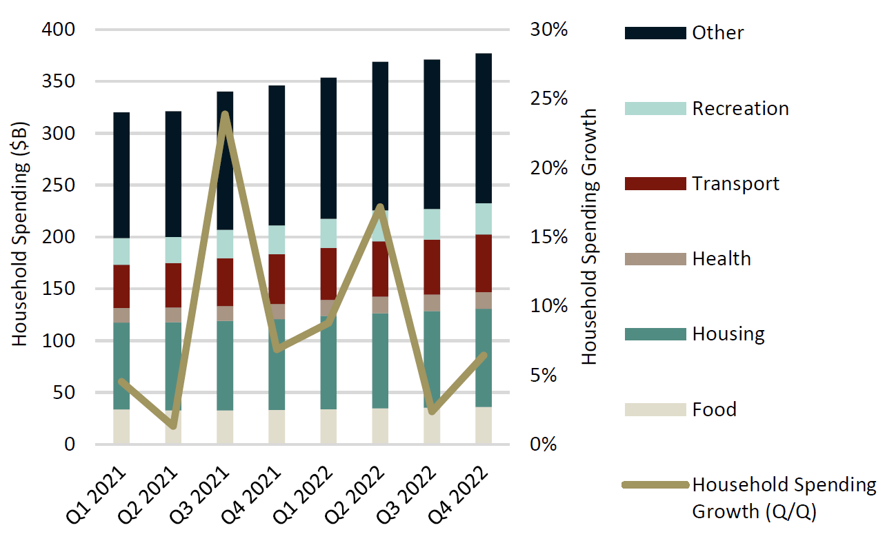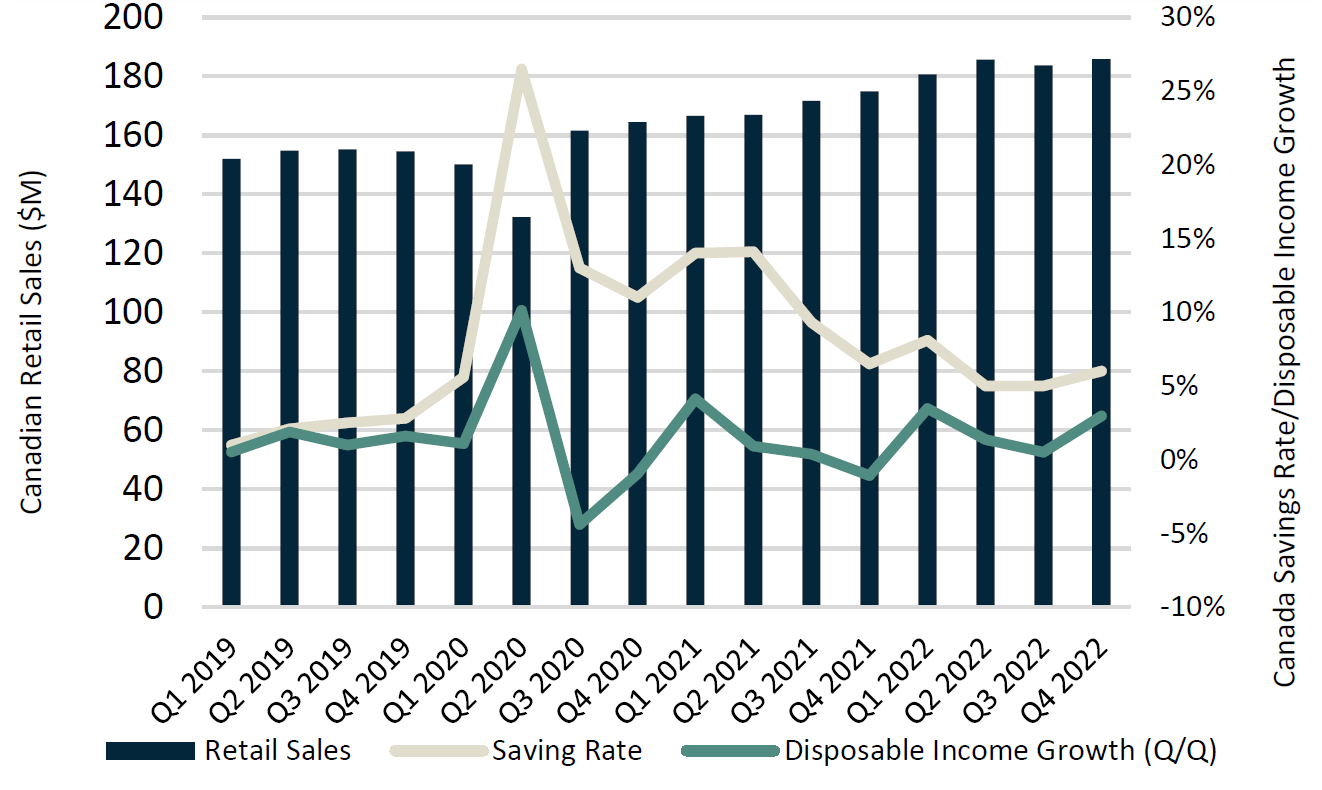 Consumer demand, as measured by retail sales, continues to grow (+1.1% Q/Q, +6.2% Y/Y) suggesting that the BoC’s rate hikes are not having their intended impact on this piece of the Canadian economy. While luxury expenses, such as spending at restaurants, has been elevated (+7.1% YoY), Canadians appear to be spending quite a bit more on the necessities. Food (+8.4% YoY), Housing (+8.5% YoY), Health (+9.5% YoY) and Transportation (+15% YoY) continue to compose approximately 62% of Canadian household expenditures, showcasing Canadian’s sensitivity to these areas. Food and housing inflation, which haven’t made as much downward progress when compared with other elements of inflation, could continue to be a major battle the BoC will have fight through 2023. We will continue to monitor these trends.