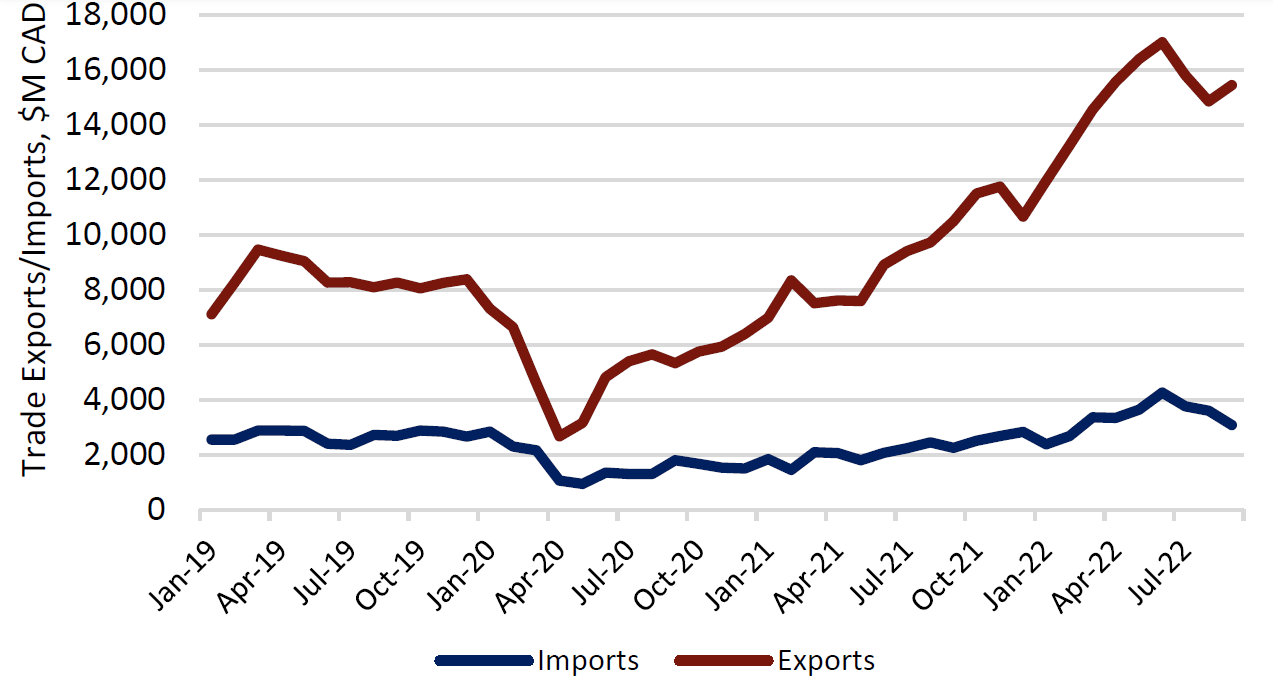 Energy products continue to be a core export in the Canadian economy experiencing a 27% price increase YTD 2022. Volumes have increased 13% in the same period.