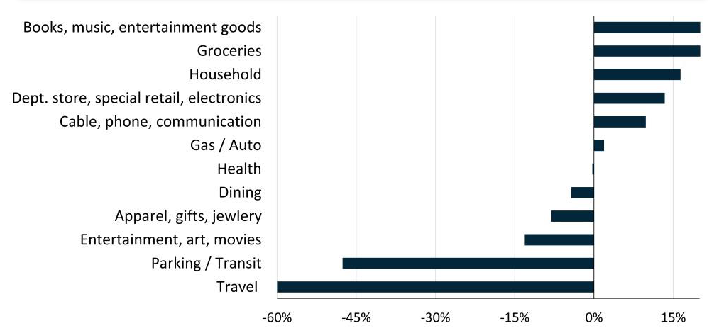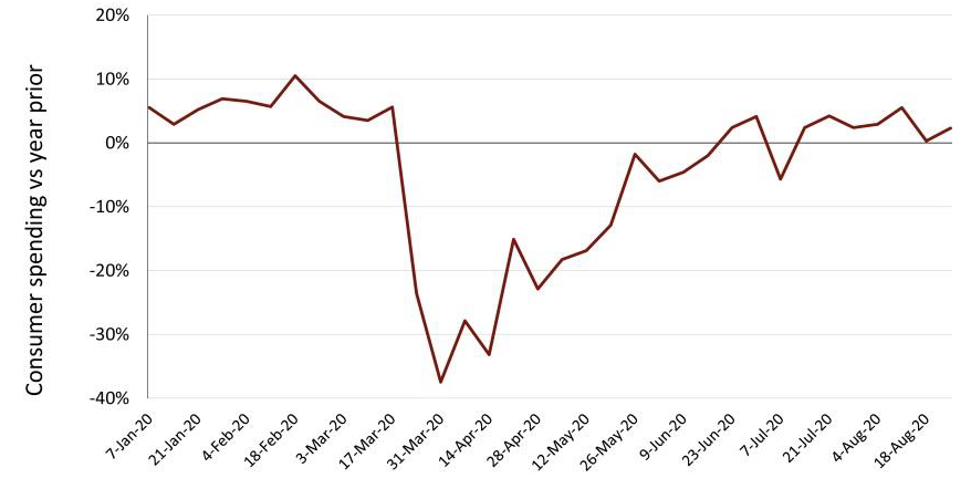Consumer spending across Canada has made a remarkable recovery with August credit card data from RBC suggesting overall spending sits roughly 3% above year ago levels. While this is certainly good news, unsurprisingly it has not recovered across the board with travel, parking/transit and entertainment sectors still experiencing cash flow headwinds