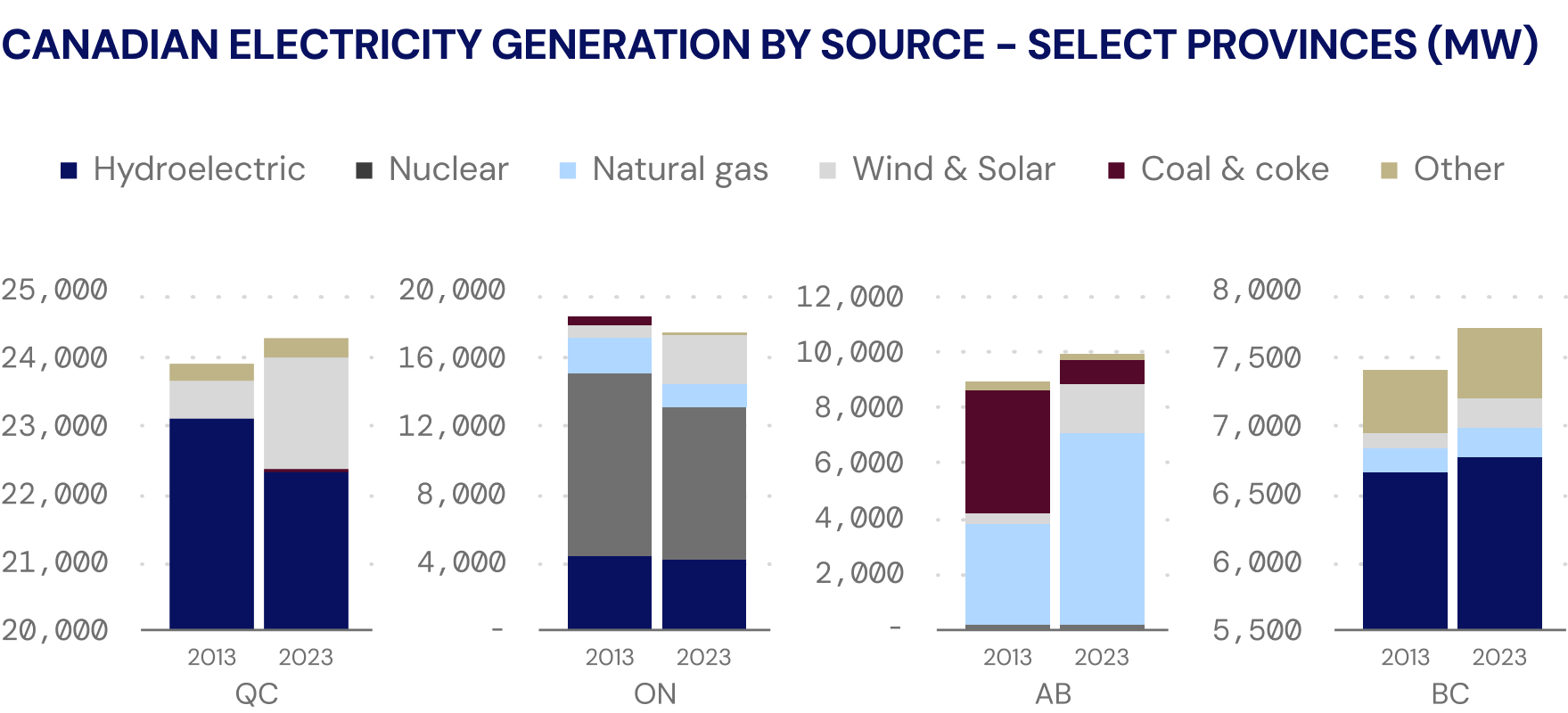 Canada Power Supply is Going Green(er): Wind and Solar have gained the most market share over the last ten years but given the demand for consistent and reliable power generation, we are skeptical this is a long-term solution to the planet’s growing power needs. Canadian provinces’ use what resources they have available, with the quickest to market being natural gas driven by Alberta and NE BC. Nuclear could be the next biggest non-carbon growth engine but the lead times are long, and AI is growing rapidly so we expect natural gas to dominate in the next 5 – 10 years.