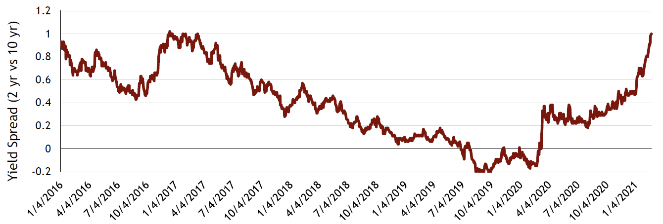 3. INCREASED INFLATION EXPECTATIONS - As indicated by the spread between the 2-year and 10-year government bond yield hitting multi-year highs, the market is increasingly convinced in an economic recovery that will drive inflation pressure and ultimately result in rising interest rates. This is constructive for near term acquisition activity as buyers will look to lock in cheaper debt and depending if the business target handles hard assets, purchasers will want to own those assets sooner than later.