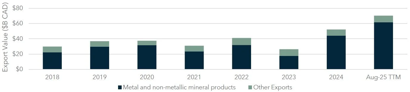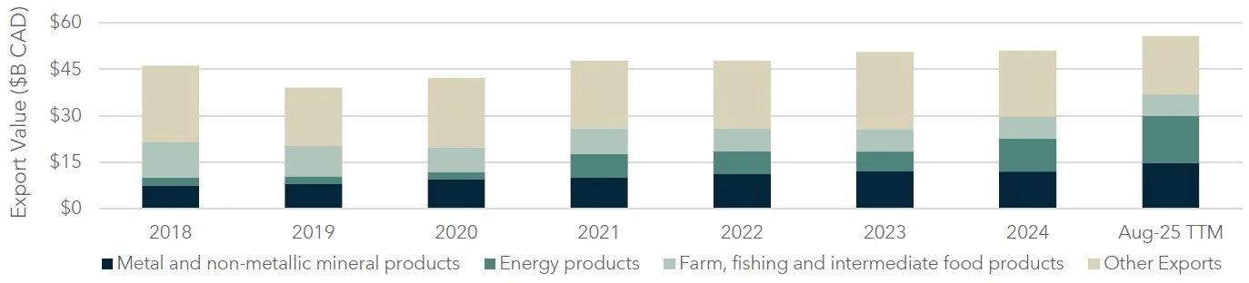 Other Exports Markets are Softening the Blow: Although U.S. export value has declined, Canada is finding momentum in other markets — notably the U.K., where exports are up 34.7% YoY, and China, up 9.3% as of August 2025. Much of this growth stems from surging demand for metals and non-metallic minerals, with exports in the category rising to $236B (from $220B in 2024). The U.K. and China now account for 68% of Canada’s total metal exports, up from 51% a year earlier — underscoring the need for Canada to keep broadening its export base beyond the U.S.