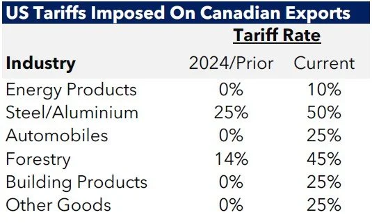 Historically, the U.S. has accounted for 75%+ of total Canadian exports – however, this has shifted downwards to 73% since new tariff policies were introduced