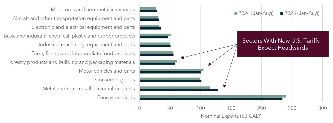 The U.S. Knows Exactly What They Want: Canadian exports to the U.S. are showing a notable sectoral shift. Autos, energy, basic materials, and forestry fell a combined $17.7B YoY through August, with tariffs driving declines in autos ($3.9B), energy ($5.5B), basic materials ($5.1B), and forestry ($3.1B). Meanwhile, metals and non-metallic minerals surged $13.2B, a 10.8% YoY increase, underscoring rising U.S. demand in these sectors. While largely anticipated, these trends signal a structural change in Canadian export patterns toward metals and minerals.