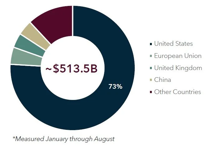 Exports to the U.K., E.U., China, and Singapore rose by a combined $17.7B through August 2025, partially offsetting the $13.0B drop in U.S. export value.